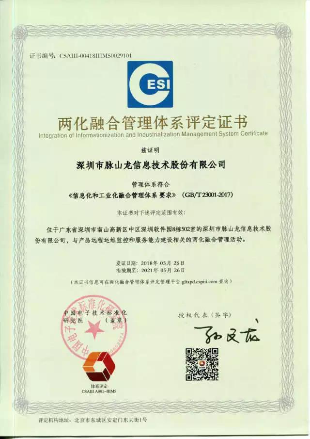 继广东省著名商标、广东省名牌产品之后,脉山龙再度成功拿下国家级两化融合认证!“两化融合管理体系”是企业系统地建立、实施、保持和改进两化融合过程管理机